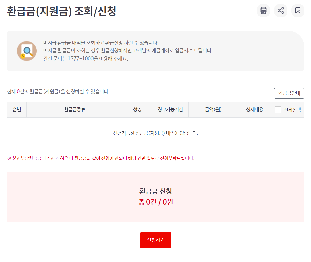 7. 환급금 조회 후 환급금이 있으시다면 신청하기를 눌러주시면 됩니다. 아쉽게도 저는 해당사항이 없네요