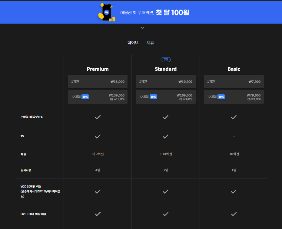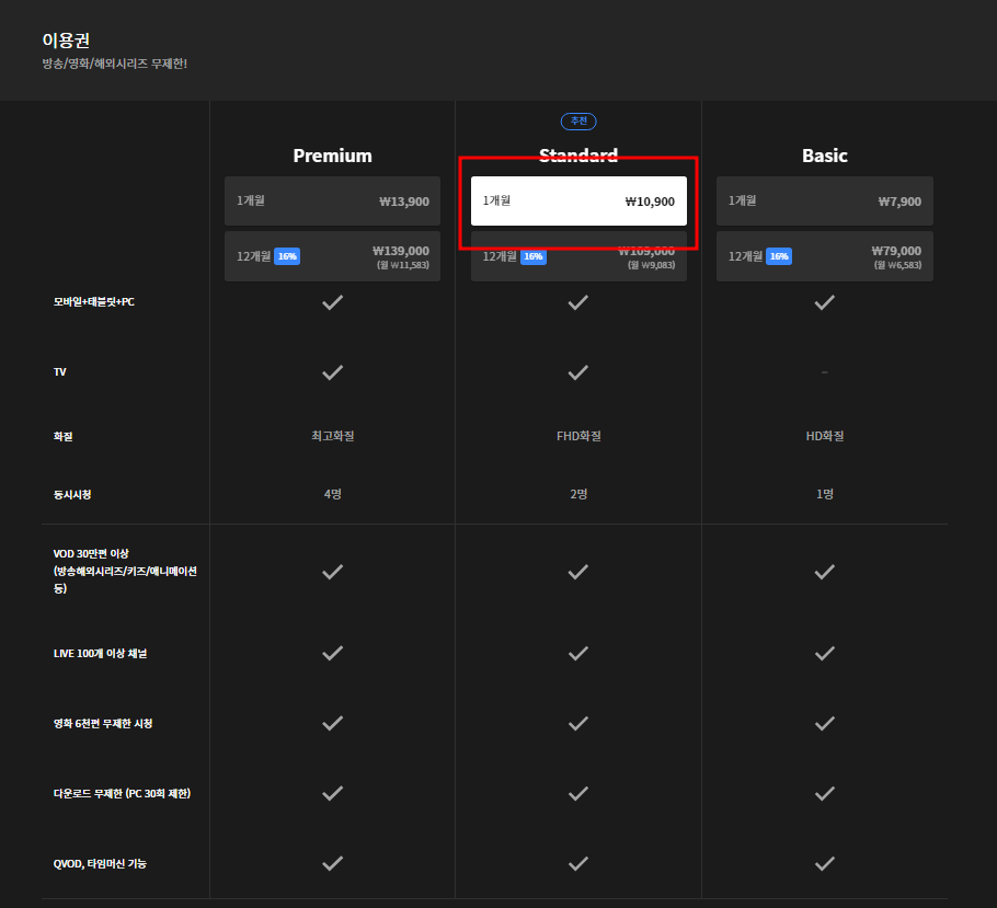 TV에서도 웨이브를 이용하시려면 최소 스탠다드 이상의 요금제를 선택하시면 됩니다. 또한 동시시청도 중요한데요. 저 같은 경우는 와이프와 제가 주로 보기 때문에 2명까지 동시시청이 가능한 Standard 요금제르 선택하였습니다.