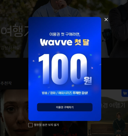 7. 로그인 하시면 웨이브의 모든 서비스를 1달 동안 100원이라는 금액으로 이용하실 수 있습니다.