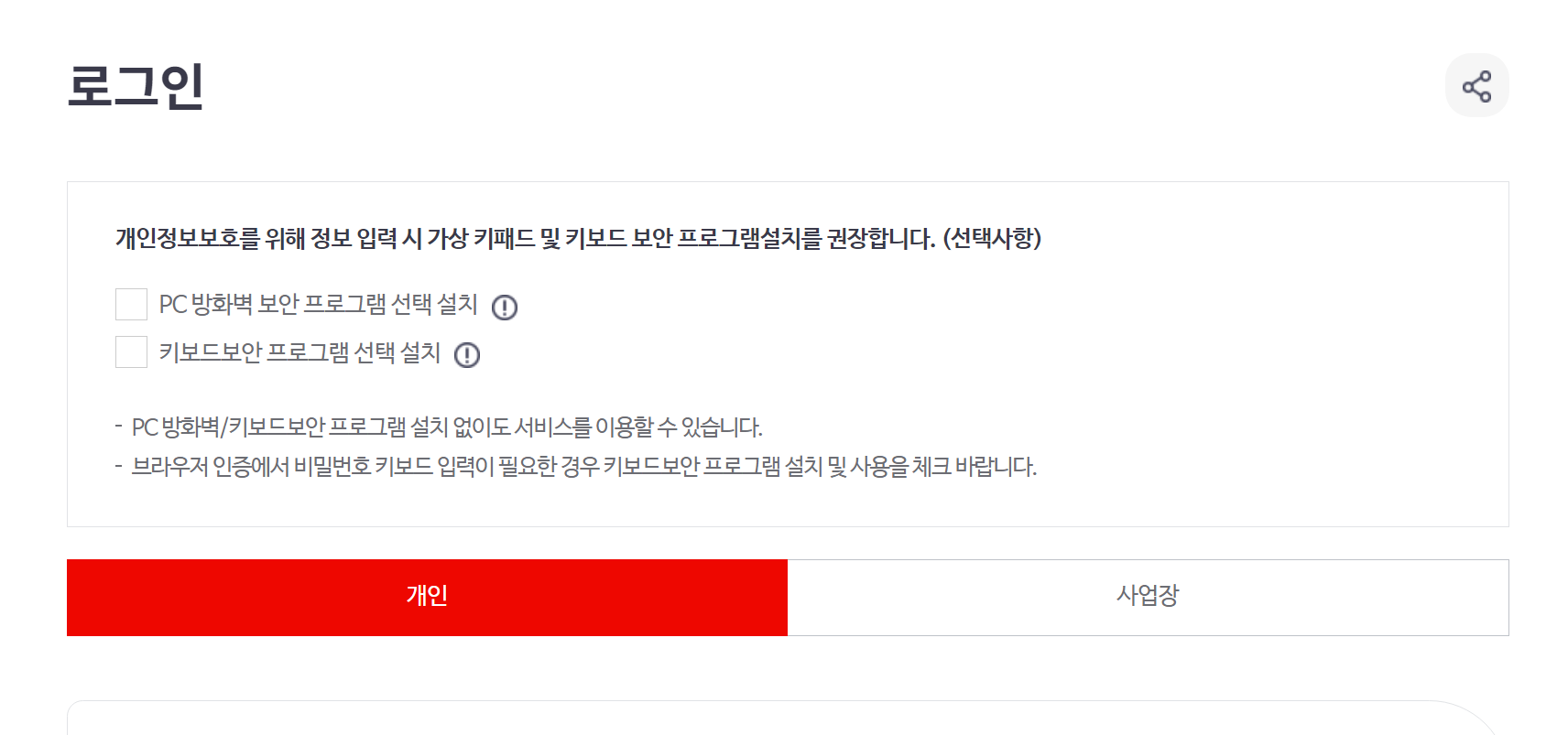 3. 로그인 절차를 실행해 주세요. 대부분 개인이시기 때문에 '개인'을 선택합니다.