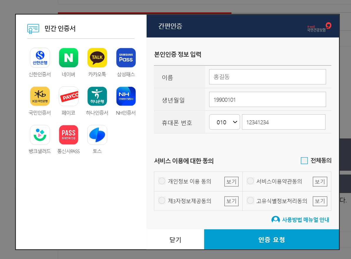 5. 간편 인증을 누르시면 아래와 같은 화면이 나옵니다. 개인정보를 입력합니다.