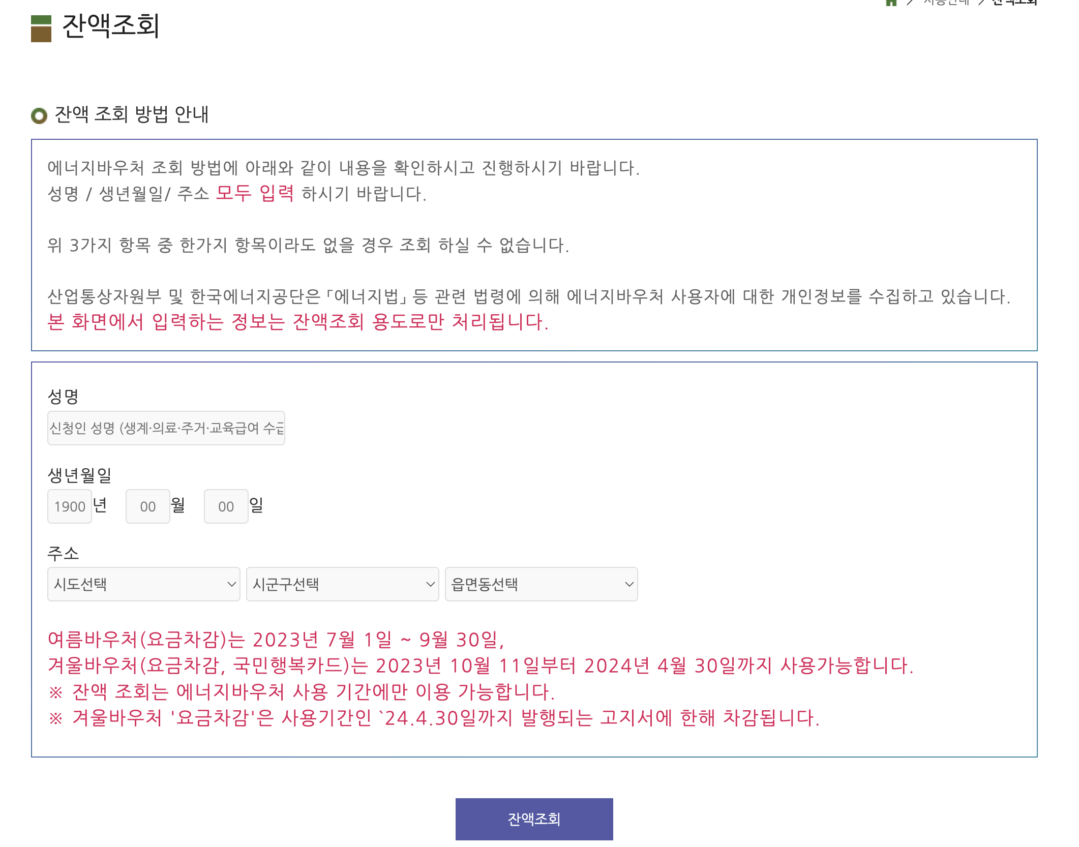여름바우처는 2023년 7월 1일부터 9월 30일, 겨울바우처는 2023년 10월 11일부터 2024년 4월 30일까지 사용이 가능합니다. 잔액 조회는 에너지바우처 사용 기간에만 가능하며, 겨울바우처 요금차감은 사용기간은 2024년 4월 30일까지 발행되는 고지서에 한해 차감됩니다.