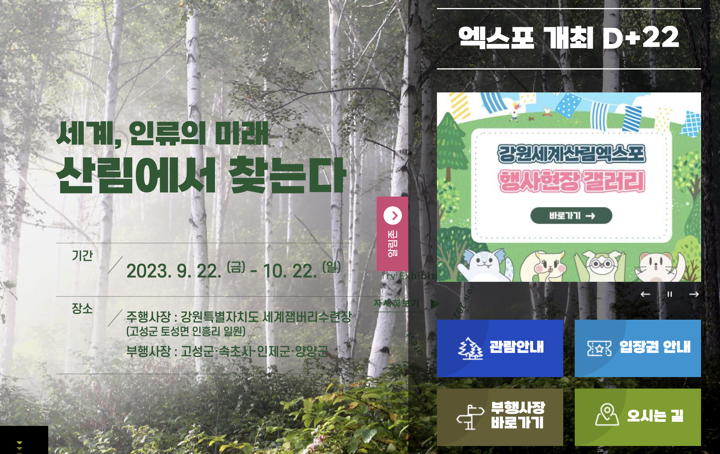 2023년 9월 22일부터 10월 22일까지 강원세계산림엑스포 박람회가 개최되고 있습니다. 박람회는 물론 단풍구경까지 한 번에 해결해 보시는 건 어떨까요? 단풍시즌이 행사시즌과 겹침에 따라 원활한 단풍구경 및 관람을 원하시는 분들은 예매 후 방문하시는 것을 추천드립니다.