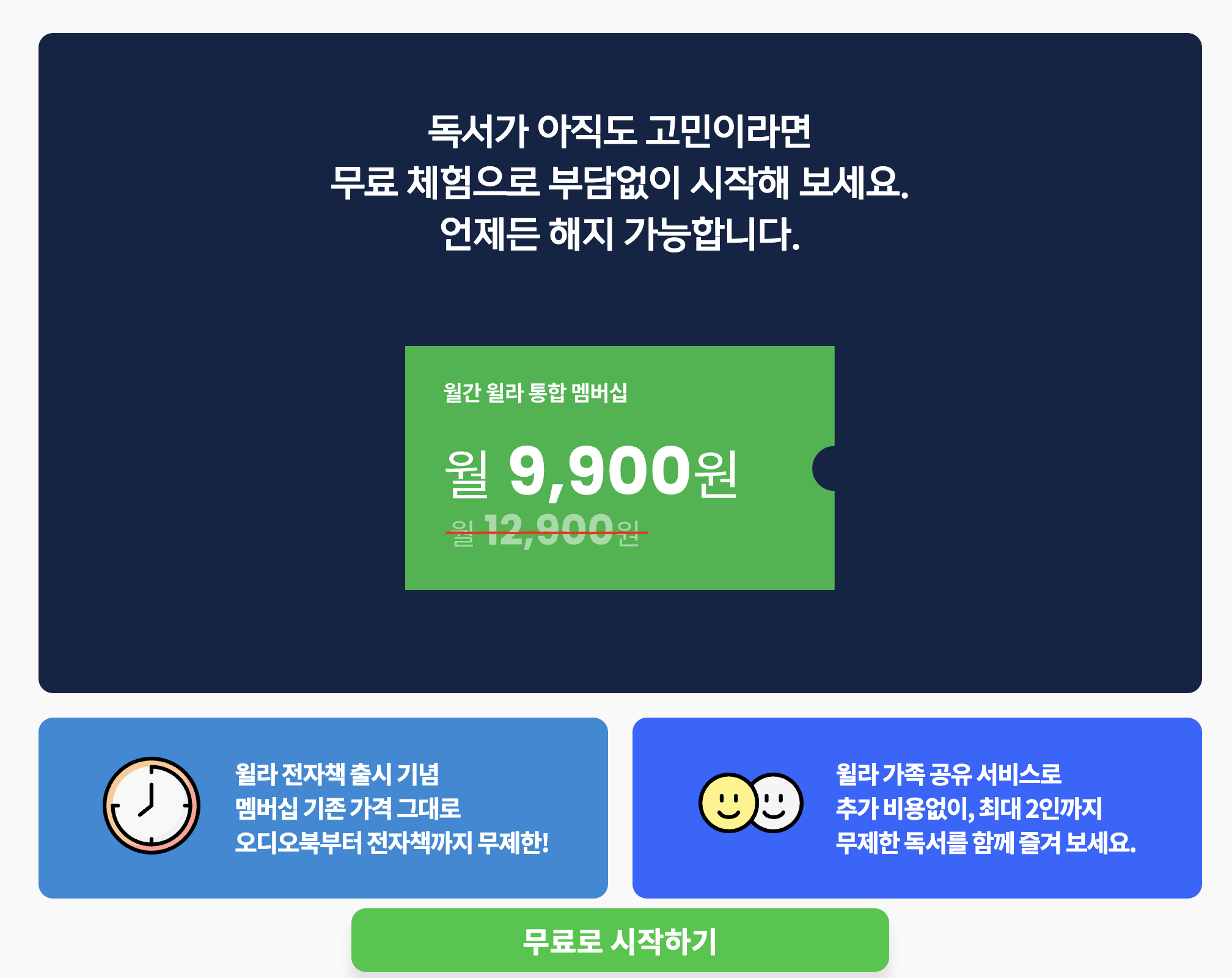 위 버튼을 통해 윌라 홈페이지에서 회원 가입을 하시면 1달간 무료 체험이 가능합니다.